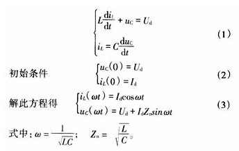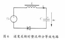 假設逆變關斷時濾波電感中的電流全部從電容C中流過,同時整流器繼續(xù)輸出電壓Ud。圖6給出了等效電路,L與C串聯(lián)諧振,由于整流橋電流只能單向流通,所以振蕩到T/4時結束。