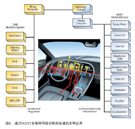 實(shí)際上,MOST是一個節(jié)點(diǎn)網(wǎng)絡(luò),用于傳輸車載多媒體和信息娛樂系統(tǒng)中出現(xiàn)的各種不同信號和數(shù)據(jù)流。MOST標(biāo)準(zhǔn)支持多種物理接口,如圖6所示。MOST標(biāo)準(zhǔn)中,這些應(yīng)用可參考功能塊。每個功能塊包括幾種功能(如一個CD播放器可以包括播放、停止、彈出和播放時間等功能)。