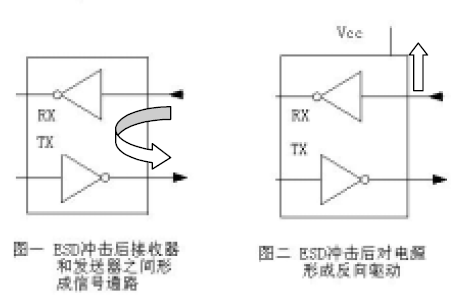 某些RS-232 接口電路中的ESD 保護(hù)結(jié)構(gòu)經(jīng)過ESD 沖擊后可能在輸入端與供電電源Vcc之間形成電流通路圖二對(duì)其供電電源產(chǎn)生反向驅(qū)動(dòng)如果供電電源沒有吸入電流的能力通常來講電源輸出回路里有一個(gè)正向二極管這將導(dǎo)致電源電壓Vcc 的增加從而損