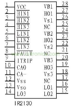 根據(jù)柵極電壓與柵極電容的乘積為柵極電荷Q則上式可轉(zhuǎn)化為T(mén)=Q/I.本設(shè)計(jì)中功率MOSFET采用IR公司的IRF3710S功率MOSFET芯片,從其datasheet可以得到MOSFET的柵極電荷為26 nC,導(dǎo)通/截止時(shí)間為106 ns,可以得到峰值驅(qū)動(dòng)電流為,驅(qū)動(dòng)電壓為12 V,本設(shè)計(jì)驅(qū)動(dòng)芯片采用IR公司的IR2130驅(qū)動(dòng)模塊,該芯片可用來(lái)驅(qū)動(dòng)工作在母電壓不高于600 V的電路中的功率MOS門(mén)器件,其可輸出的最大正向峰值驅(qū)動(dòng)電流為250mA,輸出驅(qū)動(dòng)電壓為10~20V而反向峰值驅(qū)動(dòng)電流為500 mA.它內(nèi)部設(shè)計(jì)有過(guò)流、過(guò)壓及欠壓保護(hù)、封鎖和指示網(wǎng)絡(luò),使用戶(hù)可方便的用來(lái)保護(hù)被驅(qū)動(dòng)的MOS門(mén)功率管,加之內(nèi)部自舉技術(shù)的巧妙運(yùn)用使其可用于高壓系統(tǒng),它還可對(duì)同一橋臂上下2個(gè)功率器件的門(mén)極驅(qū)動(dòng)信號(hào)產(chǎn)生2μs互鎖延時(shí)時(shí)間。它自身工作和電源電壓的范圍較寬(3~20 V),在它的內(nèi)部還設(shè)計(jì)有與被驅(qū)動(dòng)的功率器件所通過(guò)的電流成線性關(guān)系的電流放大器,電路設(shè)計(jì)還保證了內(nèi)部的3個(gè)通道的高壓側(cè)驅(qū)動(dòng)器和低壓側(cè)驅(qū)動(dòng)器可單獨(dú)使用,亦可只用其內(nèi)部的3個(gè)低壓側(cè)驅(qū)動(dòng)器,并且輸入信號(hào)與TTL及COMS電平兼容。IR2130管腳如圖2所示。