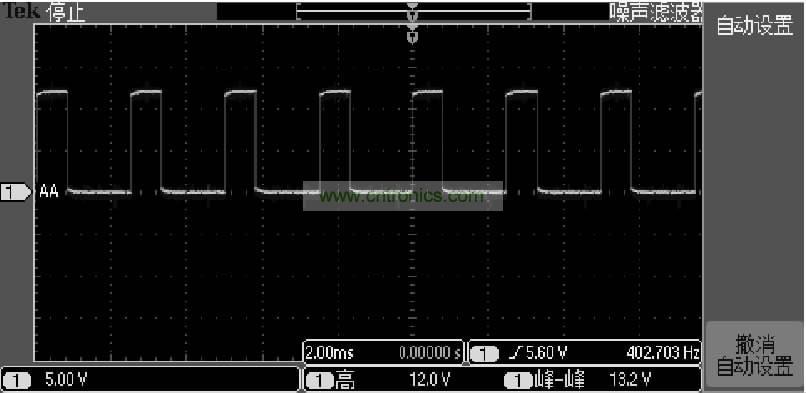 在實(shí)際應(yīng)用中柵極的驅(qū)動(dòng)波形如圖4所示,此波形是在電機(jī)3000RPM時(shí)的驅(qū)動(dòng)波形,可以看出此波形完全能夠滿(mǎn)足要求,同時(shí)進(jìn)行了短路、電機(jī)堵轉(zhuǎn)等試驗(yàn),圖3電路也能過(guò)很好地保護(hù)功率MOSFET管。