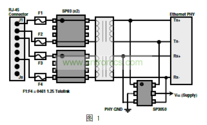 任何線路端保護(hù)裝置(這個(gè)例子中的 SP03A)不能有 GND引腳(2、3、6 和 7)連接到 GND,以保證符合 IEEE802.3隔離標(biāo)準(zhǔn);因此,設(shè)計(jì)師沒有選擇,只能將此設(shè)備作為“異模”保護(hù)器。(注:當(dāng)然,這使得驅(qū)動端保護(hù)元件成為必要,以保護(hù)系統(tǒng)免受共模事件損壞。)