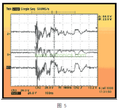 另一個(gè)要了解的重要因素是 CDE 波形,因?yàn)樗幌褚郧坝懻摰娜魏瓮{,取決于耦合機(jī)制,要么是異模,要么是共模。此外,初步研究顯示,它在特點(diǎn)上有很大差異,但總體上看,CDE 的波形能量高,體現(xiàn)在電壓和電流驅(qū)動上。波形傳播的時(shí)間為幾百納秒,能夠快速反轉(zhuǎn)極性。下面的圖 5,給出了破壞性 CDE 波形的例子,在一個(gè)以太網(wǎng) PHY 發(fā)射器引腳,一個(gè) 25 英尺雙絞線電纜靜電電壓達(dá) 1.5KV。在該事件發(fā)生超過 600ns 時(shí)間的期間,在異模波形上看到有 64.8V 從正電壓轉(zhuǎn)換為負(fù)電壓。在這個(gè)實(shí)驗(yàn)中,PHY 的發(fā)射器被破壞,無法在網(wǎng)絡(luò)上傳輸數(shù)據(jù)包。