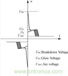6)電流—電壓特性曲線以美國克來電子公司CG2-230L氣體放電管為例,如圖2所示。