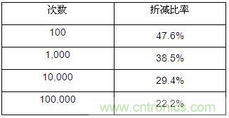 >> 主要保險(xiǎn)絲公司(AEM, Bussmann, Littelfuse)的Wire-in-air類型產(chǎn)品的耐受沖擊次數(shù)與折減比率如下表格:
