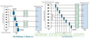 對于機頂盒設(shè)備上的 RJ45 端口,同樣考慮到因為頻繁插拔時由于靜電而導致的設(shè)備損害,在端口也可以增加上 SESD 器件來保護靜電干擾。圖4分別展示了在 10/100baseT 及 1G Ethernet 上使用 SESD 器件進行保護的應(yīng)用。
