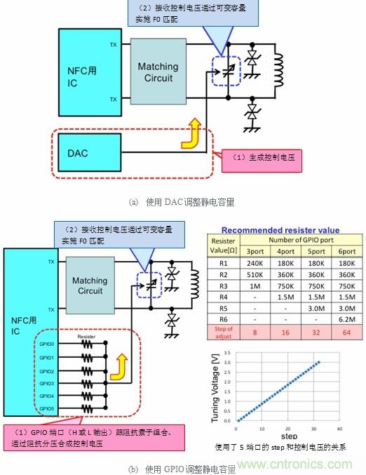 第二, 如圖2(b)所示,從NFC用IC等GPIO端口生成控制電壓來調(diào)整靜電容量。GPIO是General Purpose Input/Output的簡(jiǎn)稱,是IC芯片提供的輸出端子的一種。特定用途和信號(hào)尚未明確,但可以根據(jù)軟件指令進(jìn)行任意的輸出變化。比如說,軟件指示為輸入“0”的話則為0V,指示為輸入“1”的話則有可能會(huì)執(zhí)行輸出3V的操作。如果利用GPIO的輸出端子的話,如果收到的是0V、3V這兩個(gè)值的輸出信號(hào),那么執(zhí)行的操作就是通過2n的電子元件的組合來實(shí)現(xiàn)合成2n的阻抗電壓。