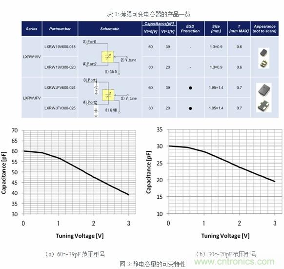 靜電容量可變特性如圖3所示,當(dāng)施加控制電壓為0~3V時(shí),配備了60~39pF范圍、30~20pF范圍的2個(gè)類型。