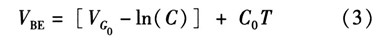 如果忽略由溫度變化引起lnT項(xiàng)變化對(duì)式(2)的影響,dVBE/dT可近似等于常數(shù)C0。常溫下C0約為-2 mV/K。為了簡化計(jì)算,則PN結(jié)關(guān)于溫度的變化方程可近似線性為![]()