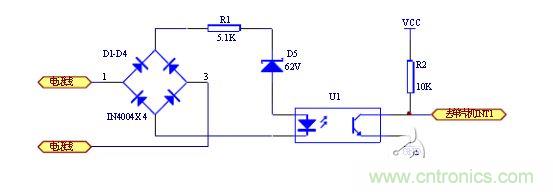 當沒有振鈴信號時,線路上的供電電壓為48V(部分交換機為60V),經四個二極管構成的全橋整流后,不足以使62V穩(wěn)壓管導通,振鈴信號輸出端電壓接近0V,當振鈴信號到來時,線路上的90V交流振鈴信號經全橋整流變換后90V的脈動直流電,其峰值足以擊穿耐壓值為62V穩(wěn)壓管,經電阻R1給U1提供電壓,從光電耦合器輸出的波形是 時通時斷的方波方波信號,可以直接輸出至單片機的中斷輸入口, CPU可以根據振鈴信號光電轉換后的高低電平檢測有無振鈴。