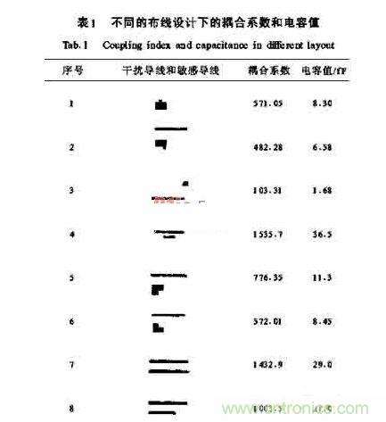 (1)印制板布局時(shí),要將模擬電路區(qū)和數(shù)字電路區(qū)合理地分開,電源和地線單獨(dú)引出,電源供給處匯集到一點(diǎn);PCB布線時(shí),高頻數(shù)字信號(hào)線要用短線,主要信號(hào)線最好集中在PCB板中心,同時(shí)電源線盡可能遠(yuǎn)離高頻數(shù)字信號(hào)線或用地線隔開。其次,可以根據(jù)耦合系數(shù)來(lái)布線,盡量減少干擾耦合。(見表1)