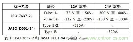 最大重復反向電壓是二極管在反向偏壓模式中能夠承受的最大電壓。在反向偏壓模式中,流過二極管的漏電流會在二極管結(jié)中產(chǎn)生熱量并導致熱失控。模擬該條件的測試包括美國的ISO-7637-2 pulse 1和3a以及日本的JASO D001-94標準type B和E.Each,這些測試的峰電壓如下表所示。