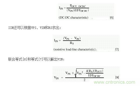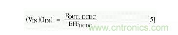 現(xiàn)在,我們有了足夠的信息來計算電源自身的耗散功率及其效率。因為電源電壓的開路值(VPS)已經(jīng)給出,我們僅需找出DC-DC轉(zhuǎn)換器的輸入電壓(VIN)。從等式[5]解出IIN: