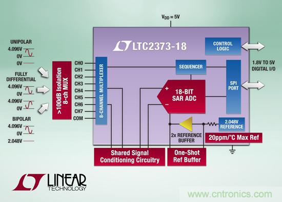 【導(dǎo)讀】近日,凌力爾特公司宣布推出具排序器的 18 位、1Msps、8 通道的逐次逼近寄存器 ADC LTC2373-18,該器件擁有卓越的 100dB SNR 性能。LTC2373-18 具可編程排序器,可存儲多達 16 個控制字,以配置多工器 (MUX) 和輸入范圍。