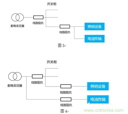 解決方法:發(fā)現(xiàn)問題后解決就比較簡單了,使大功率負載(電油炸鍋)單獨使用一條電纜后,問題解決,如圖3、圖4所示。