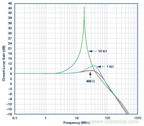 圖1的示例顯示小信號閉環(huán)增益與ADA4807-1電壓反饋型放大器頻率響應(yīng)的實驗室結(jié)果,采用同相增益為2的配置,反饋電阻為499 ?、1 k?和10 k?。數(shù)據(jù)手冊建議RF值為499 ?。