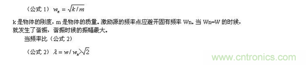 頻率可分為固有頻率Wn和激勵頻率W,固有頻率源于產(chǎn)品的結構特征,由質量、質量分布、質心位置、剛度等多個因素和多個因素間的相互作用所確定。固有頻率計算公式為(公式1)k是物體的剛度,m是物體的質量。激勵源的頻率點應避開固有頻率Wn。當Wn=W的時候,就發(fā)生了諧振,諧振時候的振幅最大。