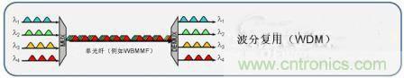波分復(fù)用是通過由不同光的波長(顏色)隔離而成的多個(gè)通道上,經(jīng)復(fù)用器匯合和分離而同時(shí)發(fā)送信號(hào)的技術(shù)。顧名思義,用于傳輸?shù)牟ㄩL頻帶被分為多段,每段都能用作通信的信道。將多個(gè)信道擠出來作為一個(gè)小頻譜是可能的。用于長途、單模系統(tǒng)的常見版本叫做密集波分復(fù)用或粗波分復(fù)用。在多模系統(tǒng)中,短波分復(fù)用技術(shù)正在出現(xiàn)。