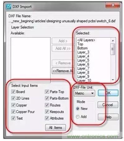 圖 5:PCB 設(shè)計工具(如這里介紹的 PADS)需要能夠使用 DXF 格式控制所需的各種參數(shù)。