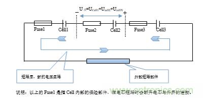 說明:以上的Fuse1是指Cell內(nèi)部的保險部件,在電芯短路時會斷開電芯與外界的連接。 Fuse1Cell1Fuse2Cell2Fuse3Cell3+_U反=UCell1+Ucell2+UcellX外部短路部件短路后,新的電壓回路。