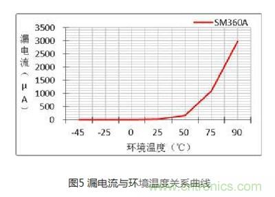 其實對二極管漏電流影響最大的還是環(huán)境溫度,下圖5是在額定反壓下測試的關系曲線,從中可以看出:溫度越高,漏電流越大。在75℃后成直線上升,該點的漏電流是導致二極管外殼在額定電流下達到125℃的兩大因素之一,只有通過降額反向電壓和正向?qū)娏鞑拍芙档投O管的工作溫度。