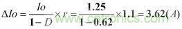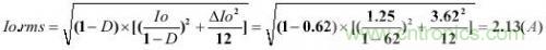假設(shè)已知連續(xù)工作模式的反激變換器,其輸出電流Io為1.25A,紋波率r為1.1,占空比D為0.62,開關(guān)頻率為60kHz,由此可以計算次級紋波電流ΔIo和有效值電流Io.rms。