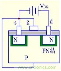 (1) VGS=0時(shí),不管VDS極性如何,其中總有一個(gè)PN結(jié)反偏,所以不存在導(dǎo)電溝道。