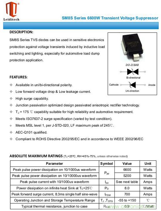 從規(guī)格書上來看,SM8S系列產(chǎn)品的功率都在6600W,通過的峰值電流由于電壓不同而變化,電壓越大,電流越小。先列出規(guī)格書來看下: