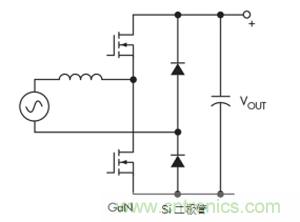 一種替代方案是連續(xù)導(dǎo)通模式圖騰柱拓?fù)?。這種拓?fù)浣Y(jié)構(gòu)充分利用了GaN的所有關(guān)鍵特性,最終導(dǎo)致尺寸更小、工作頻率更高的設(shè)計(jì)(圖4)。GaN的零反向恢復(fù)對(duì)于實(shí)現(xiàn)該拓?fù)涮貏e重要。