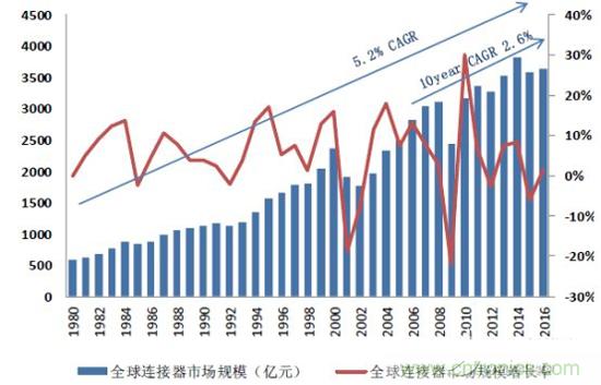 這是因?yàn)槿蜻B接器市場(chǎng)已經(jīng)連續(xù)近40年來持續(xù)增長(zhǎng),據(jù)Bishop&Associate數(shù)據(jù),全球連接器市場(chǎng)從1980年的594億元增長(zhǎng)到2016年的3643億元,復(fù)合增長(zhǎng)率高達(dá)5.2%,近十年來增速放緩,復(fù)合增長(zhǎng)率為2.6%。從年度來看2016 年全球連接器市場(chǎng)達(dá)到 544 億美元,同比增長(zhǎng) 4.5%,依然保持穩(wěn)健成長(zhǎng)的態(tài)勢(shì)。中國(guó)市場(chǎng)表現(xiàn)更優(yōu),增速約為全球市場(chǎng)增速 2 倍,同比增長(zhǎng)10%,達(dá)到159.4億美元,占全球比例接近30%,遠(yuǎn)高2010年的 20%。雖然全球連接器市場(chǎng)2014年之后出現(xiàn)暫時(shí)性下滑,但隨著中國(guó)經(jīng)濟(jì)觸底反彈以及智能化升級(jí),必將繼續(xù)帶動(dòng)這一產(chǎn)業(yè)向前快速發(fā)展。
