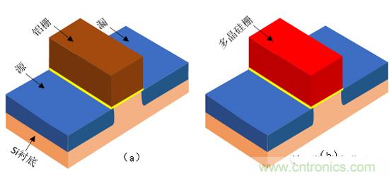 MOS誕生之初,柵極材料采用金屬導(dǎo)體材料鋁,因為鋁具有非常低的電阻,它不會與氧化物發(fā)生反應(yīng),并且它的穩(wěn)定性非常好。柵介質(zhì)材料采用SiO2,因為SiO2可以與硅襯底形成非常理想的Si-SiO2界面。如圖1.13(a)所示,是最初鋁柵的MOS管結(jié)構(gòu)圖。