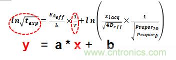 這個一般描述可解釋為直線函數(shù) y = ax + b,其中 y 代表暴露時間 texp 的 ln√,x 代表 1/T(= 絕對溫度 T [開爾文] 的倒數(shù)),如圖 3 所示。