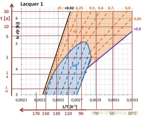 由于標(biāo)準(zhǔn)化的暴露時間 ln√texp 是溫度倒數(shù) 1/T 的直接函數(shù),所以可用一個圖表,亦即用 ln√t – 1/T 圖描述和總結(jié)元件在整個溫度-濕度-時間域中的性能和健康預(yù)測,以及其系統(tǒng)特征鑒定: