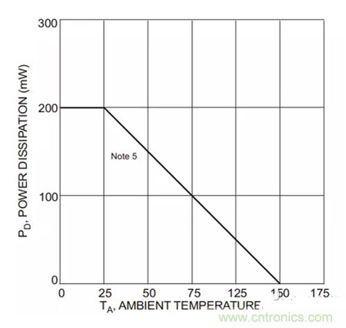 在0~25℃是,耗散功率恒為200mW,在25~150℃時(shí),線性遞減,到達(dá)150℃,耗散功率為0,在這個(gè)溫度,硅管已經(jīng)不能工作了。從這個(gè)表中,可以計(jì)算出熱阻,其線性部分斜率倒數(shù):