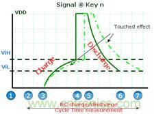 在STM8S的解決方案中,ST提供了感應(yīng)電極和走線(xiàn)的設(shè)計(jì)規(guī)范和如圖3所示的Driven Shield功能(在Shield線(xiàn)上提供與按鍵管腳相同的驅(qū)動(dòng)信號(hào),電極與Shield之間的寄生電容就不會(huì)被充放電),能有效地減少感應(yīng)電極走線(xiàn)的寄生電容對(duì)按鍵靈敏度的影響。