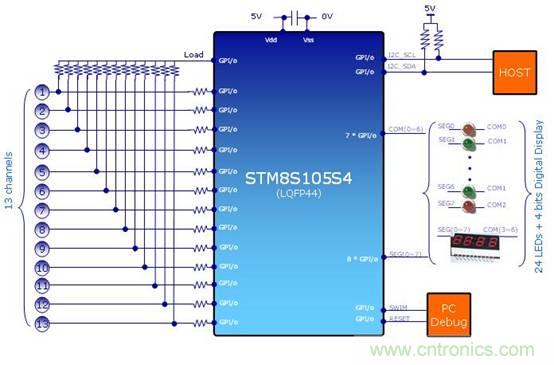 電磁爐是采用磁場(chǎng)感應(yīng)電流的加熱原理對(duì)食物進(jìn)行加熱。加熱時(shí),通過(guò)面板下方的線(xiàn)圈產(chǎn)生強(qiáng)磁場(chǎng),磁力線(xiàn)穿過(guò)導(dǎo)磁體做的鍋的底部時(shí),鍋具切割交變磁力線(xiàn)而在鍋具底部產(chǎn)生渦流使鍋底迅速發(fā)熱,達(dá)到加熱食物的目的。在本解決方案中采用44pin的STM8S105S4做按鍵顯示板的主控芯片,控制13個(gè)按鍵的掃描、24個(gè)LED及一個(gè)4位數(shù)碼管的顯示、I2C與主板的通訊,并留有一個(gè)SWIM接口方便工程師調(diào)試之用(如圖2)。
