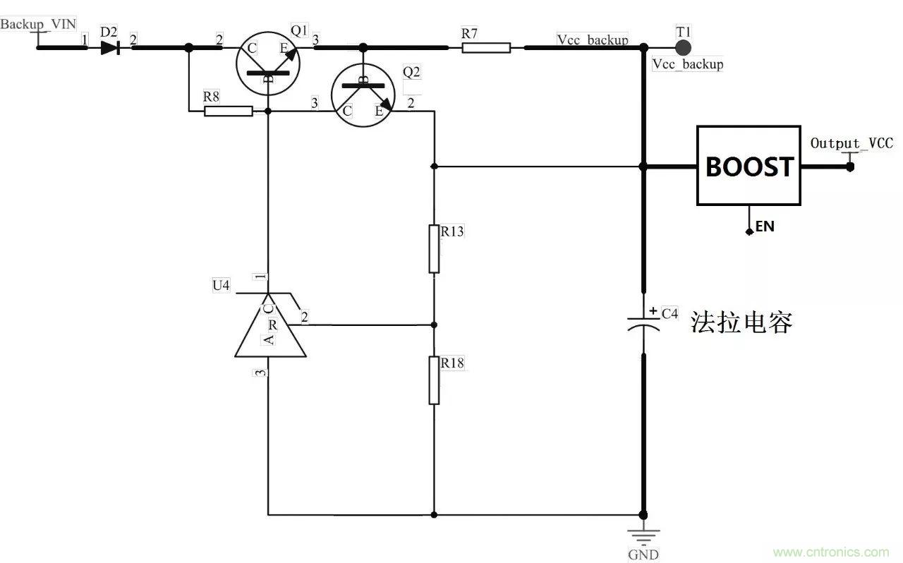 若對(duì)電壓高于法拉電容本身電壓上限的電源系統(tǒng)提供掉電續(xù)航時(shí),Vcc_backup端需通過(guò)BOOST升壓電路后以實(shí)現(xiàn),且注意系統(tǒng)正常時(shí)(充電過(guò)程中)關(guān)斷EN腳。