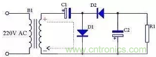 二倍壓整流電路還有另外一種形式的畫法,見圖15,其原理與圖12完全一致,只是表現(xiàn)形式不一樣。