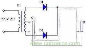 半波整流電路見下圖。其中B1是電源變壓器,D1是整流二極管,R1是負載。B1次級是一個方向和大小隨時間變化的正弦波電壓,波形如圖2所示。0~π期間是這個電壓的正半周,這時B1次級上端為正下端為負,二極管D1正向?qū)?,電源電壓加到負載R1上,負載R1中有電流通過;π~2π期間是這個電壓的負半周,這時B1次級上端為負下端為正,二極管D1反向截止,沒有電壓加到負載R1上,負載R1中沒有電流通過。在 2π~3π、3π~4π等后續(xù)周期中重復上述過程,這樣電源負半周的波形被“削”掉,得到一個單一方向的電壓,波形如圖3所示。由于這樣得到的電壓波形大小還是隨時間變化,我們稱其為脈動直流。