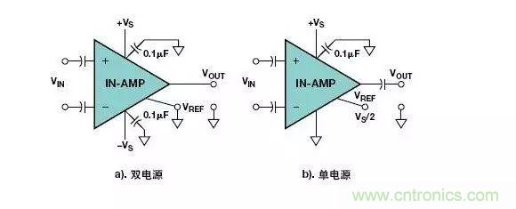 類似的問題也會出現(xiàn)在儀表放大器電路中。圖3示出了使用兩只電容器進(jìn)行AC耦合的儀表放大器電路,沒有提供輸入偏置電流的返回路徑。這個問題在使用雙電源(圖3a)和單電源(圖3b)供電的儀表放大器電路中很常見。