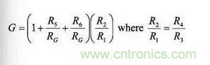 例如,流行的儀表放大器設(shè)計(jì)配置使用上圖所示的三運(yùn)放結(jié)構(gòu)。其信號總增益為