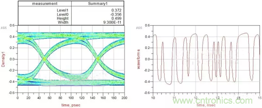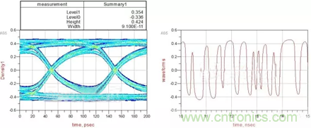從結(jié)果可以看到:眼圖的寬度為97ps,高度為0.652V,信號的峰值為0.479V。