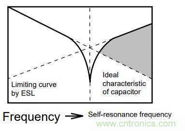 MLCC有經(jīng)典的V型阻抗-頻率曲線。隨著頻率升高,寄生電感的影響開始凸顯,阻抗先變小再變大,這是MLCC的固有特性。曲線中的最低點(diǎn)就是MLCC的自諧振頻率。