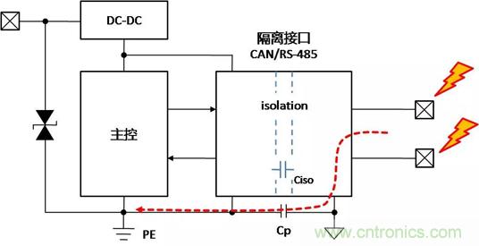 帶隔離通信接口的設(shè)備,在不同的使用、安裝狀態(tài)下,接口會表現(xiàn)出完全不同的ESD特性,了解設(shè)備在不同的使用狀態(tài)下,ESD對接口的影響的機(jī)理,才能有針對性地增加保護(hù)器件,提升隔離接口的ESD能力。下面以帶有隔離CAN或RS-485通信接口為例,對常見的設(shè)備狀態(tài)下,ESD的作用機(jī)理進(jìn)行分析,并提出相應(yīng)的改善措施。