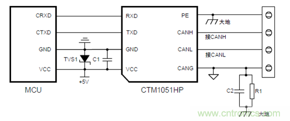 由于設(shè)備實(shí)際應(yīng)用中會存在各種不同的狀態(tài),對于與上述描述不同的情況,也可按以上的方法進(jìn)行分析,并有針對性的增加保護(hù)器件,從而達(dá)到提升ESD抗擾能力的作用。廣州致遠(yuǎn)電子有限公司基于多年的總線防護(hù)設(shè)計(jì)積累推出了高防護(hù)等級隔離模塊——CTM1051(A)HP系列。該系列符合國際ISO11898-2標(biāo)準(zhǔn),靜電防護(hù)等級可達(dá)接觸±8kV,空氣放電±15kV,浪涌防護(hù)可達(dá)±4kV隔離CAN解決方案,具體如下圖15所示,能夠適用于各種惡劣的工業(yè)現(xiàn)場環(huán)境。應(yīng)用簡便,即插即用,應(yīng)用原理圖如下圖16所示。