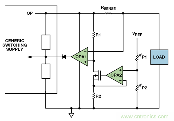 為了得到可變的電流,將基準(zhǔn)電壓——來自黑磚頭或本地——施加于P1 和P2 所代表的電位計(jì)。OPA2 和MOSFET通過R1 輸出小電流,在其上產(chǎn)生壓降。負(fù)載電流流過檢測電阻。若檢測電阻上的電壓由于負(fù)載電流超過R1 上的壓降而有所下降,那么OPA1 輸出將上升,覆蓋磚頭中的電壓控制,并限制其輸出電壓,防止輸出電流超過限值。