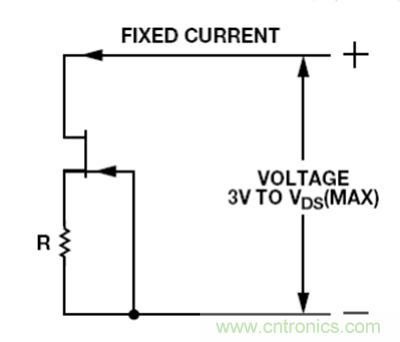 若精度不是問題,且只要求剛性單極性電流源,則可以采用耗盡型JFET和一個(gè)電阻組成電流源。如圖 12 所示,這種配置在溫度發(fā)生變化時(shí)并不十分穩(wěn)定,且對于給定的R值,各器件的電流可能有相當(dāng)大的差異,但該配置簡單而廉價(jià)。