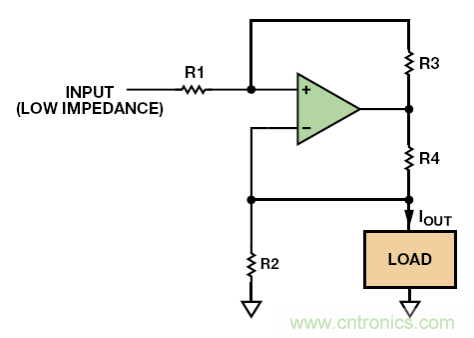 目前為止,我們討論的電路都是單極性的——電流在一個(gè)方向上流動(dòng)——但雙極性電流電路也是可行的。最簡單、使用最廣泛的當(dāng)數(shù)Howland電流泵,如圖 9 所示。這款簡單的電路有很多問題:它對電阻匹配的精度要求極高,以獲得高輸出阻抗;輸入源阻抗會(huì)增加R1 電阻,因此它的數(shù)值必須非常低以最大程度降低匹配誤差;電源電壓必須比最大輸出電壓高得多;并且運(yùn)算放大器的CMRR性能必須相對良好。