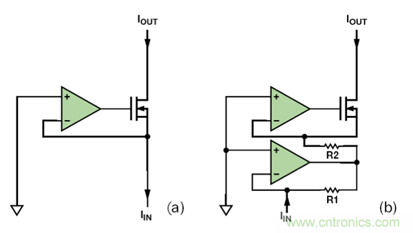 電流鏡具有相對較高、有時(shí)非線性的輸入阻抗,因此它們必須由高阻抗電流源(有時(shí)亦稱為剛性電流源)提供電流。若輸入電流必須具有低阻抗吸電流能力,則需使用運(yùn)算放大器。圖 6所示為兩個(gè)低ZIN電流鏡。