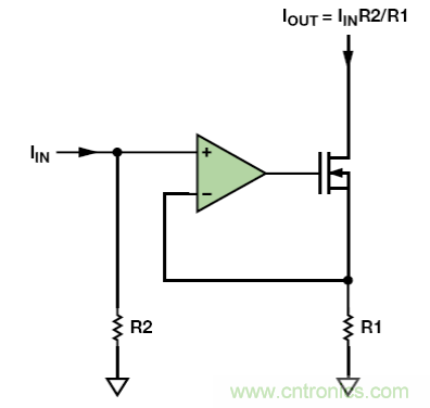 若單芯片IC中需要用到電流鏡,則最好使用簡單的晶體管電流鏡。然而,若采用分立式電路,其匹配電阻高昂的價(jià)格(價(jià)格高是因?yàn)樾枨罅坑邢?,而非制造困難)將使圖 5 中的運(yùn)算放大器電流鏡成為最便宜的技術(shù)。該電流鏡由跨導(dǎo)放大器和一個(gè)額外的電阻組成。